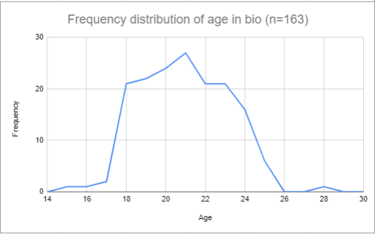 This is my estimate of how age is distributed in bios on social media based on a quick 10 min exercise. Look at the precipitous drop at 25.